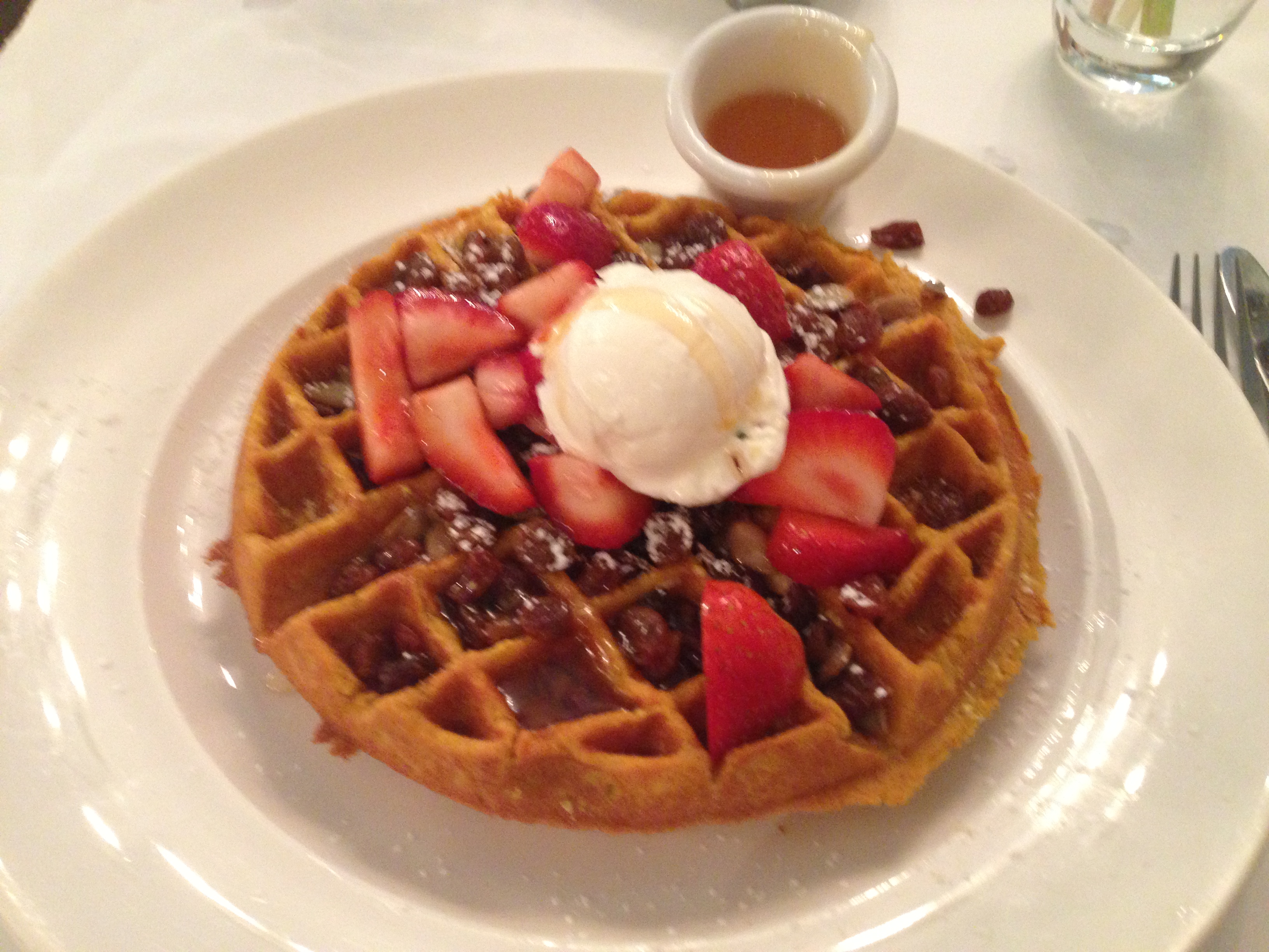 Review: My life is now different. My aunt ordered it a few years back and I fell in love with it then. This time I figured I would have it as my dish because I can get eggs benedict anywhere. Warning: it’s super filling and flavorful. And the best waffles I have ever had; it’s worth noting that I’m not a waffle fan but love this one. The flavor explosion starts with the raisins and pumpkin seeds, scattered in and over the waffle. It then continues with fresh sour cream and drizzled organic honey from Doerfler’s Farm. Even the waitress applauded me for my order, calling it a “good choice” as she smiled. Honestly, anything here is a fabulous choice. My best friend ordered the lemon ricotta pancakes- delicious.