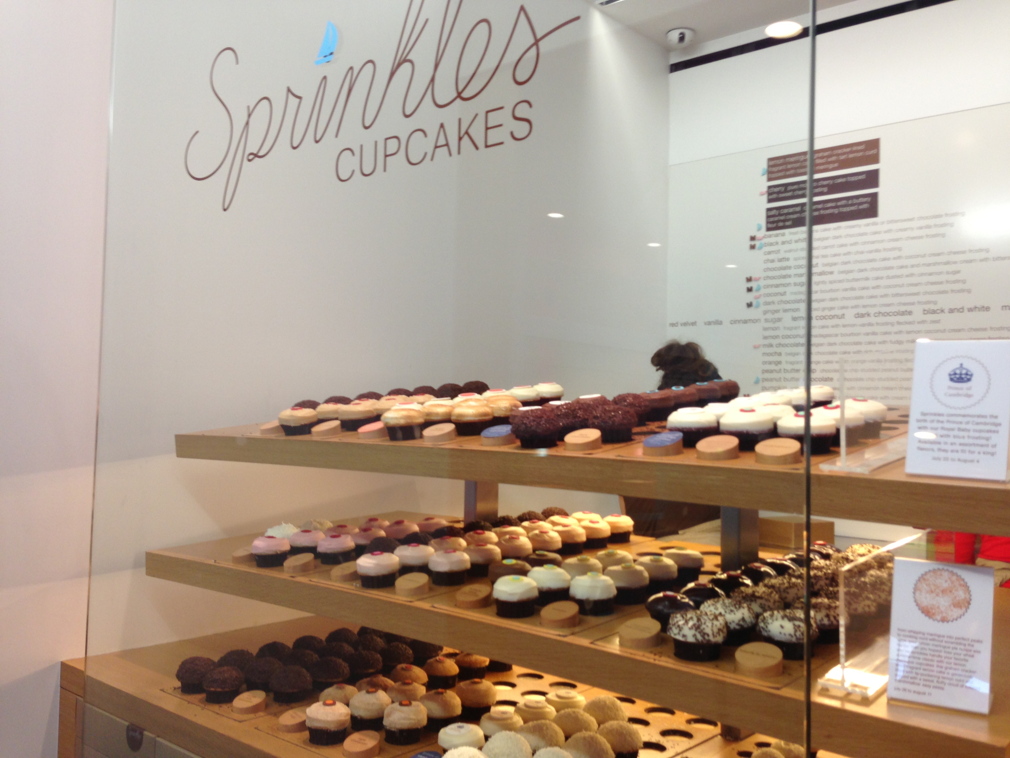 Sprinkles: my favorite cupcakes in Georgetown. Once I located a Manhattan Sprinkles on Yelp, I was so overcome with granulated sugar-ridden memories from D.C. that I walked right over. Delighted as per usual, I took my sweet (ha ha) time to choose a cupcake flavor. Eventually, I listened to the petite angel on my left shoulder and found a happy medium: a mini cupcake. After that laborious decision process, I finally chose strawberry cake with strawberry frosting for two reasons. Reason #1: I had my Two Little Red Hens chocolate on vanilla concoction a few hours before. Reason #2: Strawberry cake and frosting give me a daily serving of fruit, right?