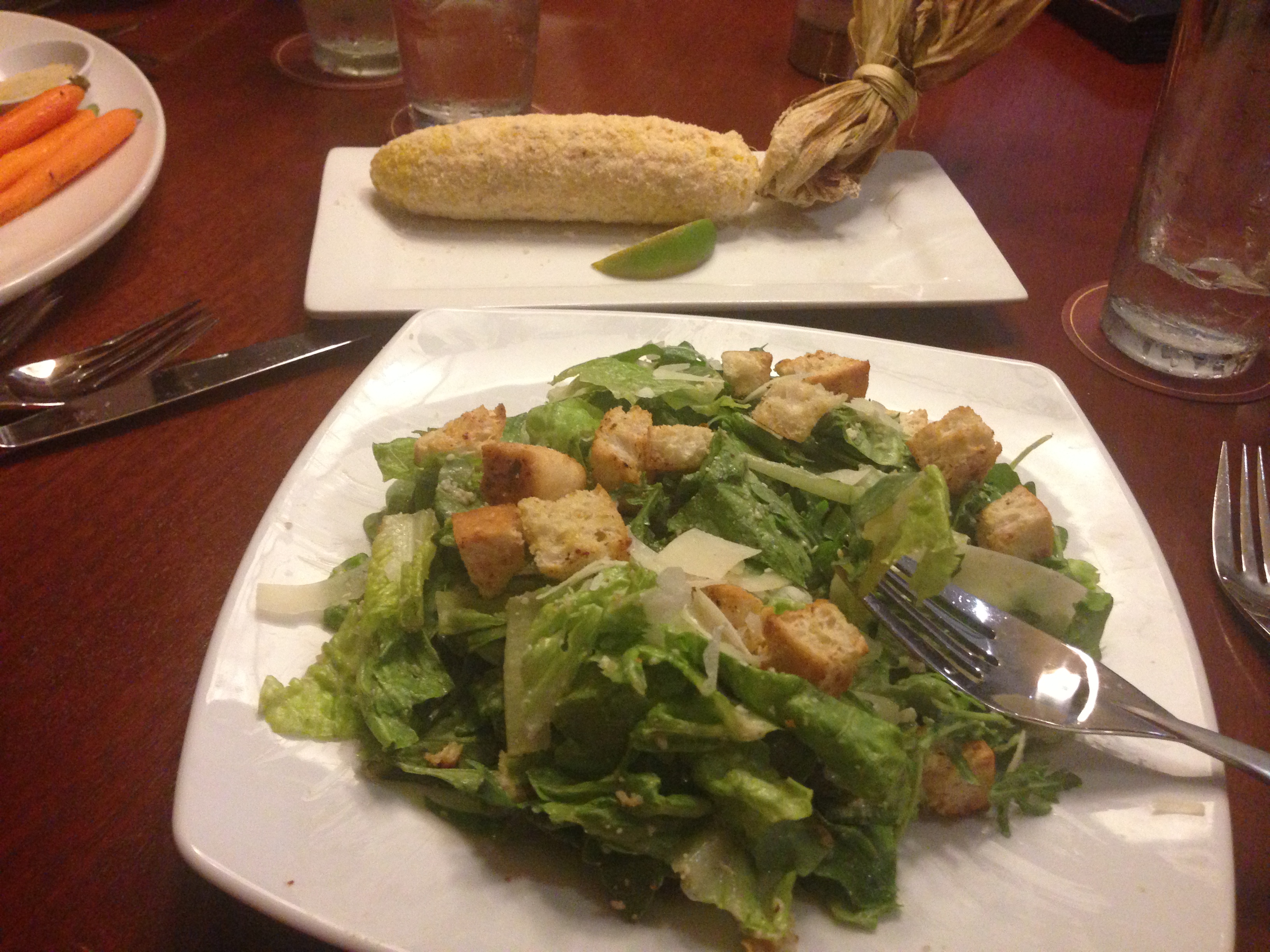 Order: Crisp romaine and baby kale caesar salad, chili and parmesan rubbed corn side and a pecan pie mini indulgence
