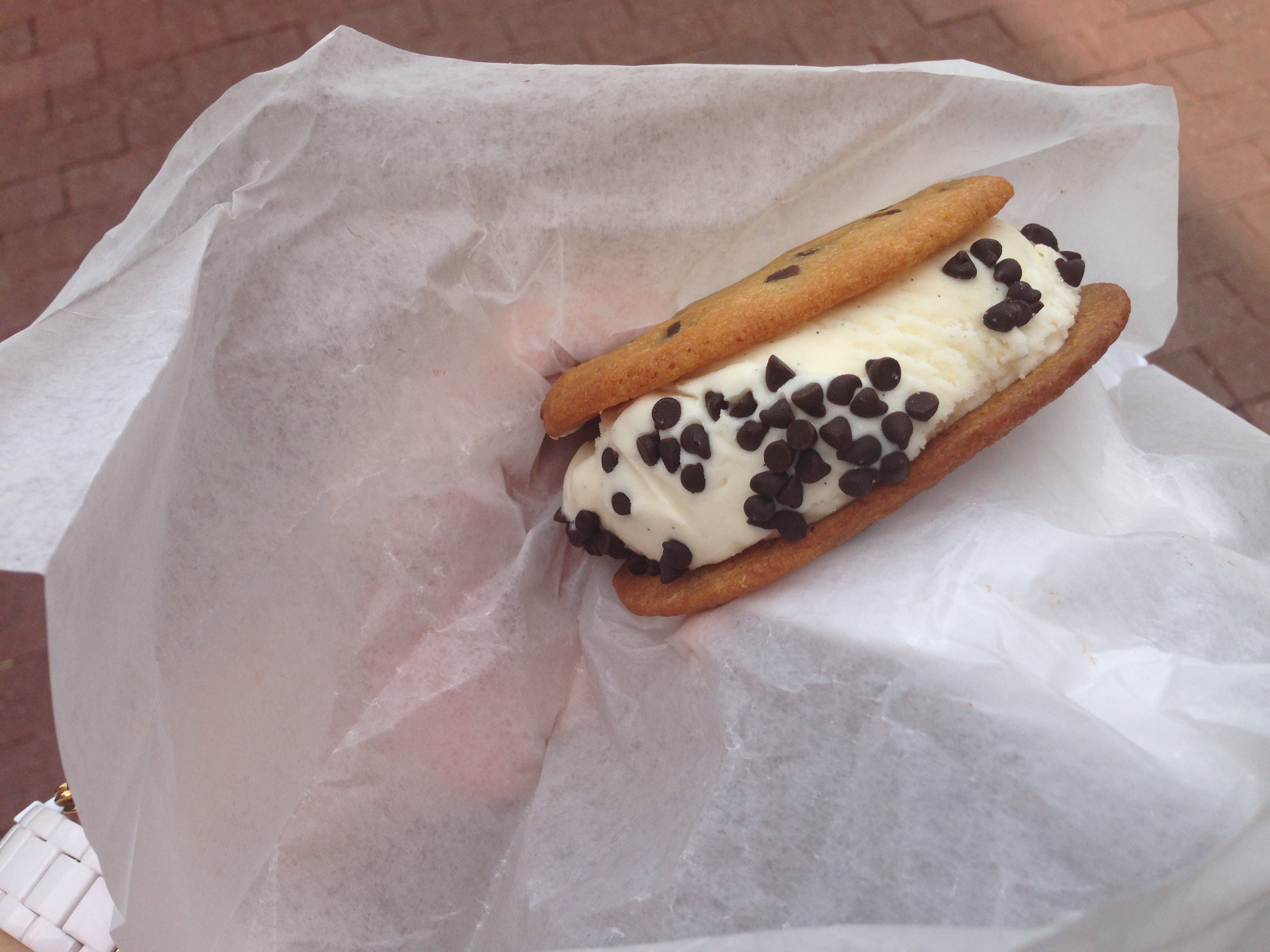 Review: OH MY GOODNESS. This was insane. The cookie came tightly-wrapped and perfectly chilled, so it wasn’t messy at first. But the second I got outside under the DC sun and started chowing down, I found myself fighting fate and the dripping of the creamy vanilla filling. The fresh chocolate chip cookies had a great flavor and were ideally chewy, while the ice cream was smooth and boasted the perfect consistency. I’m definitely getting another one once I’m back in Georgetown. This sammie is certainly giving Insomnia Cookies a run for its money. Plus, this one came decorated with chocolate chips on the outside trim of the ice cream. A+ for presentation.